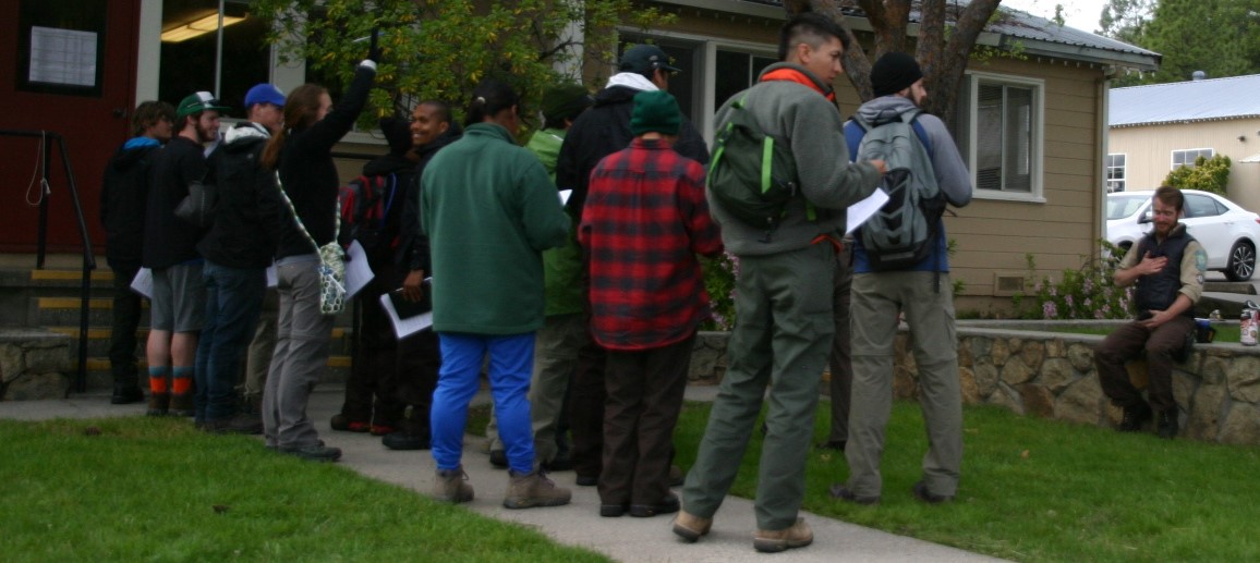 The crews will line up outside of the temporary Backcountry admin building (a commandeered meeting room), forms are distributed, and CMs find the nearest flat surface on which to fill out the forms. Two hours are allotted for this process. Once the forms are completed, they are collected and sent inside to the admin staff, who will then process every single piece of paper that comes through. Every space has to be filled out correctly, and supporting employment eligibility documentation needs to be verified. Emergency notification forms need to be accurate, so that family can be quickly contacted in the event a CM has an emergency. It is critical that this documentation be completed before the crews leave here, because when they leave, they will be scattering all across California to places with no cell phone service, Internet, of fax machines.